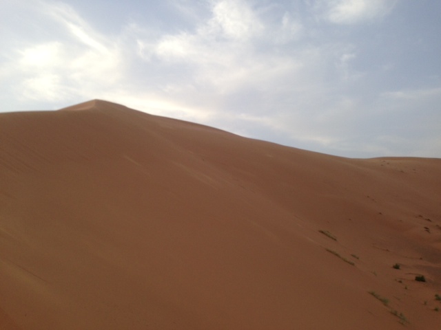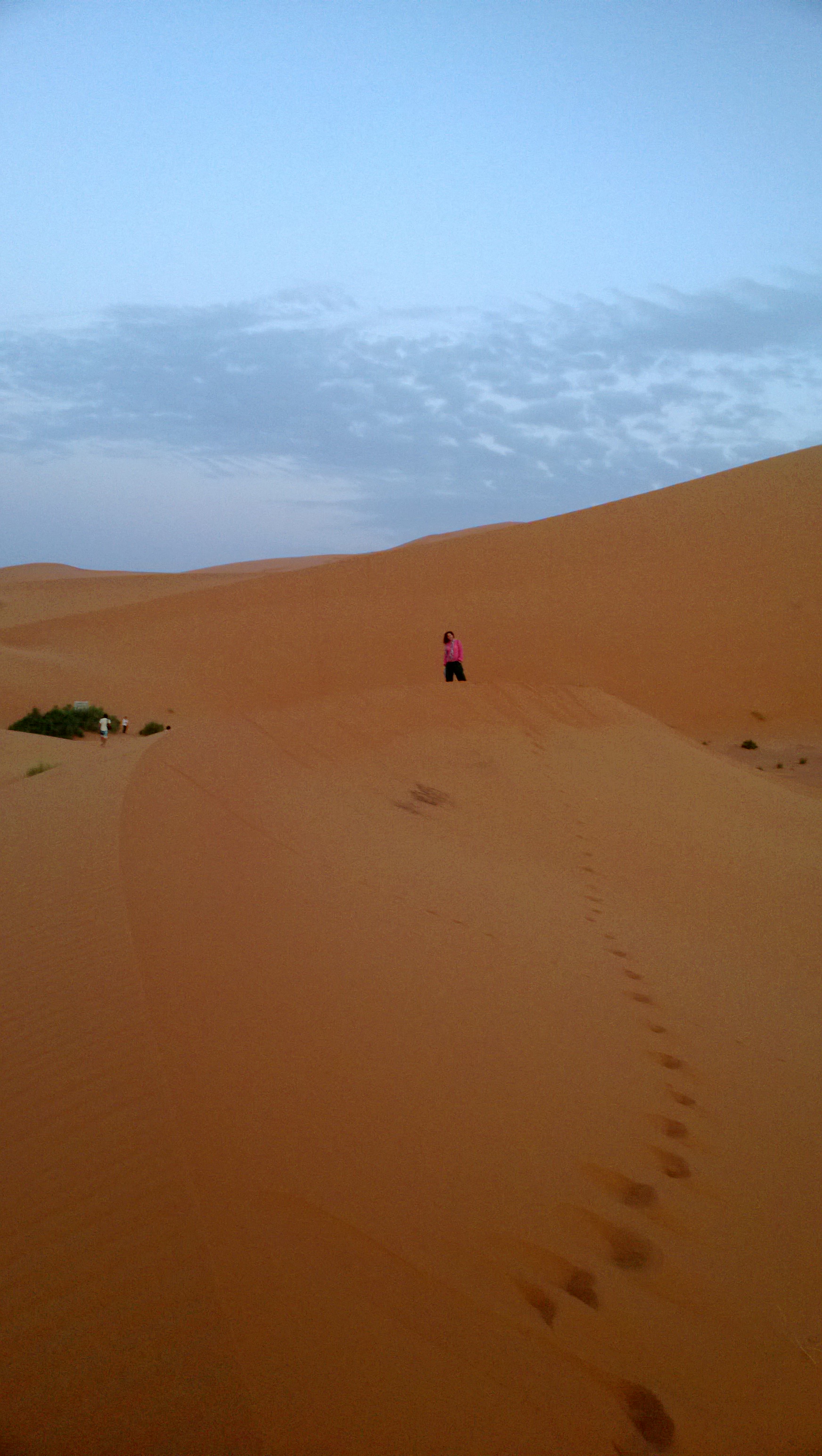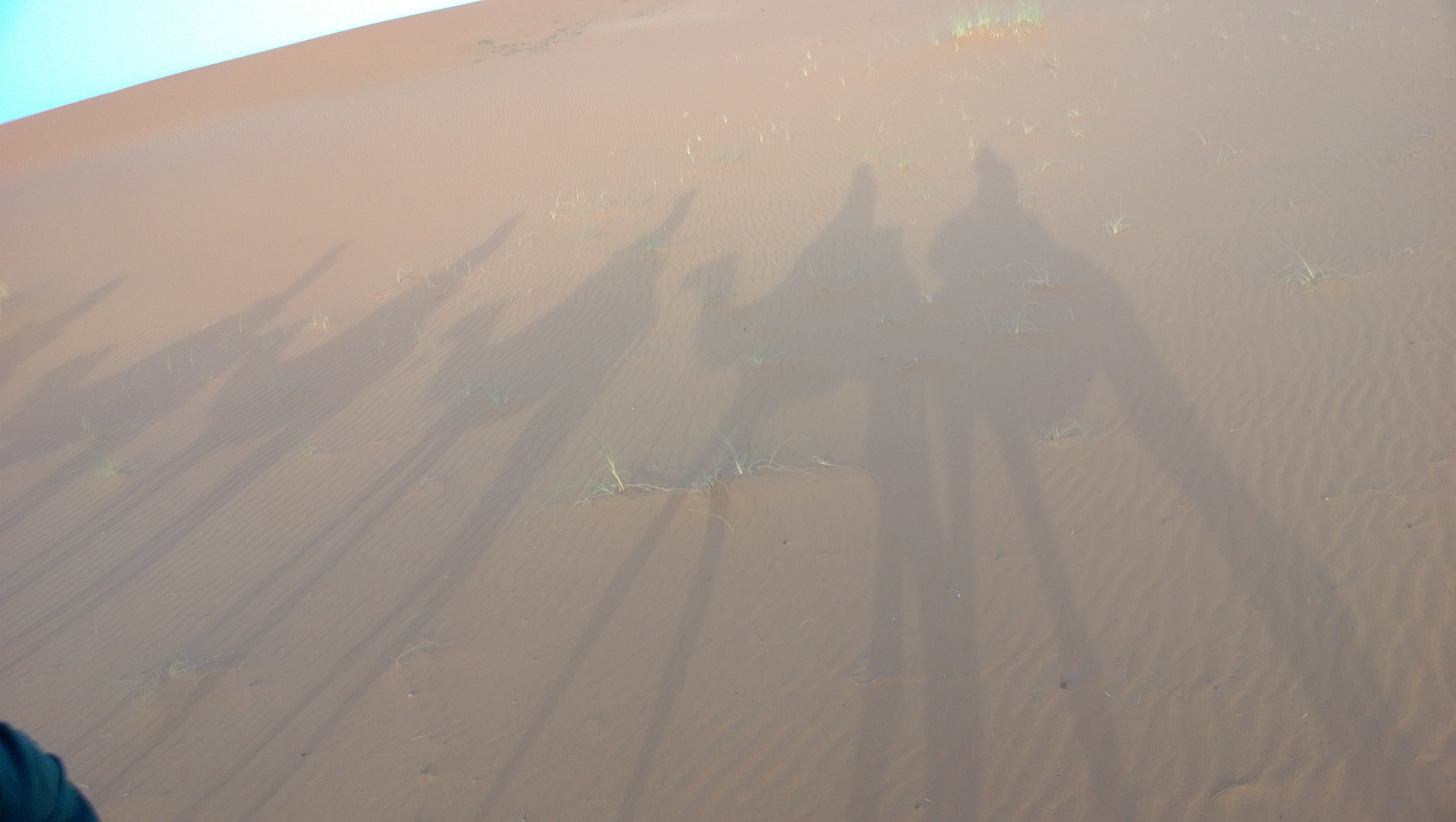 bu kadar detaydan sonra işin en güzel kısmı çöle gelelim. gittiğimiz gün gündüz inanılmaz bir kum fırtınasını izledik otelden ve gidemeyeceğimizi düşündük. ama yusuf ve hamit tecrübeyi dinlememiz gerektiğini söyleyerek bize gülümsediler. altı gibi hazırlıklarımızı tamamladık ve yusuf bizi kum fırtınasından koruyacak şekilde yüzümüzü gözümüzü berberi sitilde sardı. 🙂 ve develere binmek için artık hazırdık. deve dediğimiz hayvanı yabana atmayın. otururken bile yüksek. oturduktan sonra önce arka sonra ön ayaklarıyla kalktığından yerden yüksekliğiniz birinci kattaki bir eve eşit sayılır 🙂 altı kişi biz ve rehberimiz yine bir yusufla başladık. diğer yol arkadaşlarımız avustralyalı bir aile olan kevin, eşi tina ve iki çocukları. yaklaşık bir buçuk saat deve üzerinde yolculuğumuzda ardımızda önce kasbahın kuleleri sonrasında dört taraf kum olacak şekilde devam ettik. ilerledikçe etrafta sadece kum taneleri kaldı. ve sonunda zafer. devasa bir kum tepesinin dibinde olan çadırlarımıza ulaştık. hava kararmaya başlamıştı. etrafta ufak bir yürüyüşten sonra yusuf bize akşam yemeği hazırlarken bizde avustralyalı aileyle çadırda değil dışarda birlikte geceyi geçirmek için anlaştık. döşeklerimizi serdik ve muhteşem çöl havasını soluyarak yusuf’un yaptığı muhteşem tajin ve salatayı yedik. bu tajin fas’ta yediğimiz en iyi yemekdi diyebiliriz. sonrasında muhteşem bir yıldız festivali. o karanlık çölde milyonlarca yıldızın oluşturduğu ışık hüzmeleri ile sohbet ve gülce ile yıldızlara bakarak uykuya dalmak.