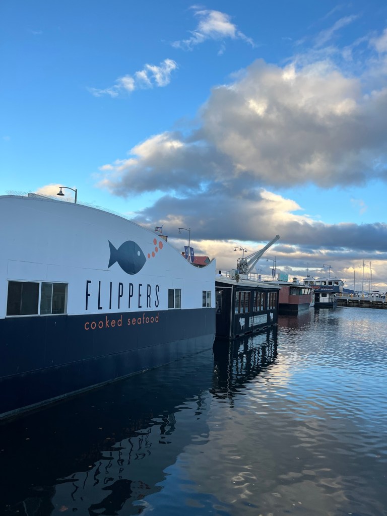 Hobart Avustralyanın en az yağış alan başkentlerinden biri. Gittiğimiz gün şehre yıllarca yağmayan yağmur kendini boca ediverdi üzerimize. Olsun dedik gezginin makbulü ıslansa da oflamadan puflamadan keyif almaya devam edenidir. Liman tarafında böyle bizim Eminönü balık ekmek tekneleri misali suda yüzen yanyana fish and chips ve deniz ürünleri dükkanı var. Aldık balıklarımızı yağmurın altında ıslana ıslana yedik. Aslında Tazmanyaya yıllar önce gelmiştik bir kez ama Hobartta pek vakit geçirememiştik. O nedenle bu sefer pek başka yere kımıldamadan,araba sürmeden adeta Evropa turisti gibi olup sadece Şehirde vakit geçirelim istedik. Yağmurda sığındığımız her küçük alanda sanat attı üstümüze Hobart. Boyasını,fırçasını alan buraya yerleşmiş sanki.