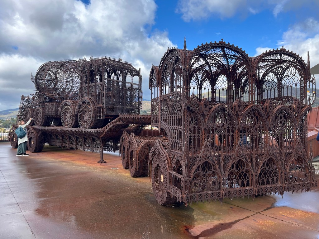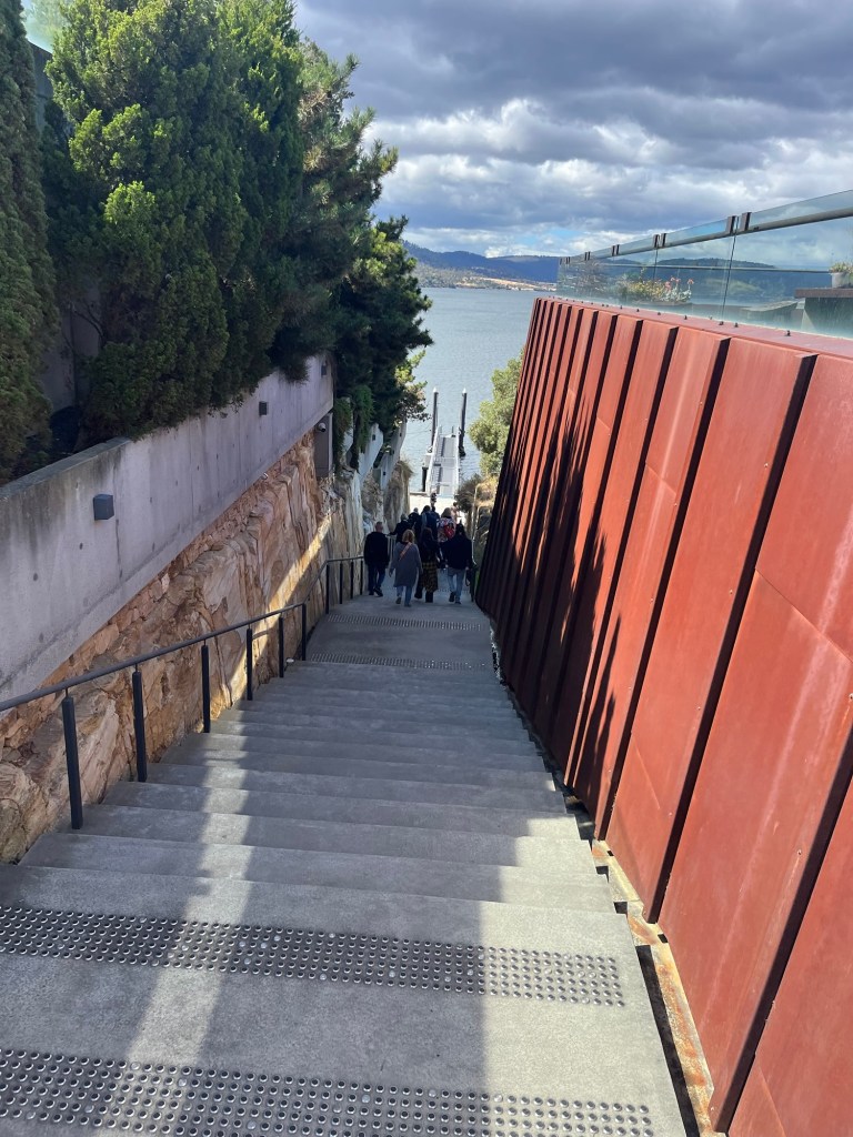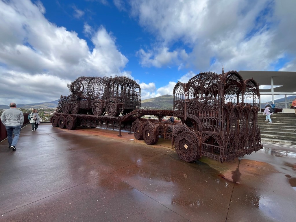 Sonraki gün Mona adlı galeriye gittik. Modern ve eski sanat müzesi. Buraları gülce anlatır size diye umuyorum, biz şehirden ido vapuru ile gittik, çok güzeldi, tasman bridge denen harika köprünün altından geçtik, dünyanın en büyük çinko fabrikarından birinin önünden geçtik, Monaya vardık. Çok değişik ve çok güzeldi. Sonrasında bahçesindeki çimlerde öğle atıştırması yapıp, güneşin yüzünü göstermesiyle biraları afiyetle içtik. ( Mona aslında benim için bu Hobart seyahatinin en önde gelen sebeplerindendi. Beni en çok binanın mimarisi ve üzerine oturduğu arazi ve manzara etkiledi dersem sanat severler tarafından linç edilirim belki. Şaka bir yana oldukça etkileyici eserler ile birlikte bu ne şimdi dediğim ve modern sanatta sınırımın kaka ve estetikten uzak çok sayıda cinsel uzuv olduğunu fark ettiren eserler de. Ama genelinde kesinlikle dolu dolu ve insanı etkileyen,keyif veren,düşündüren bir müze. Aslında benim aklım daha çok şehir müzesinde o esnada olan bir başka sergide kaldı ama kısmet değilmiş. Sanata doyduk şükür)
